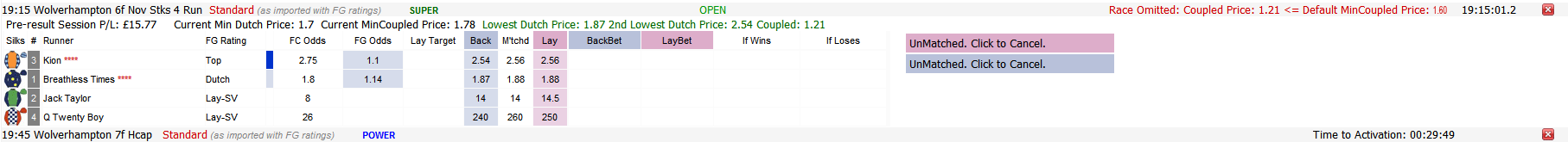 The screenshot below of Min Coupled Price parameter in a real world scenario shows that although the Min Dutch Price for 'Breathless Times' of 1.87 is satisfactory, when including another short-priced horse in the Dutching bet the Min Coupled odds of 1.21 is less than the required value set as 1.6 and therefore the race is voided. Although the race was a winner, the stakes required would have been too high.