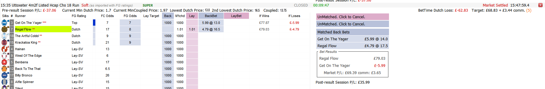 Whilst a variable parameter, it also has an element that is hard-coded to only be initialized when the live odds => FormGenie Odds x 2 (in other words the horse must be trading at least double the FormGenie calculated odds before this feature is executed). An example of the merit of this feature has just occurred whilst writing this piece. In the 1.35 Lingfield the Formgenie-Bot backed the Top-Rated STEAL THE SCENE. The horse finished 2nd in a photo and was beaten by FLECKERL. With Use SuperValue checked FormGenie-Bot also backed the winner at 27 (to £2). The Forecast Odds was 15, the SP was 21 and FormGenie Odds calculated the true chance to be 6.5. Thus 27 was more than double the FormGenie 'true' odds so a bet was submitted.