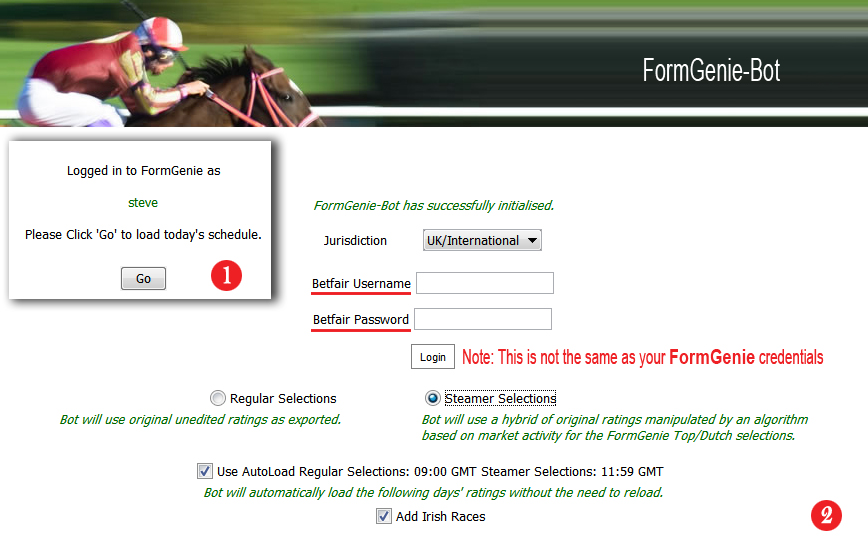Note: Whilst FormGenie-Bot can be left unattended to run all day and place bets in accordance with your settings, it's important to note that the bot will not be able to continue if any of the following circumstances arise:
