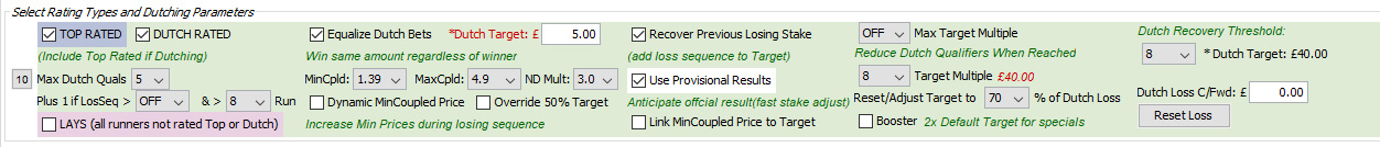 The Max Target Multiple allows you to taper the number of Dutch qualifiers in accordance with the size of your recovery. If Max Target Multiple is reached then the number of Dutch Qualifiers is reduced to 2 regardless of your Max Dutch Qualifiers setting. Furthermore, if the recovery target exceeds Max Target Multiple x 2 then the number of Dutch Qualifiers is reduced to 1. For example your Max Target Multiple is set to 10 x £10 Target. When your recovery loss reaches £100 the Bot will only submit bets on 2 selections (and not 3 or 4). If this/next race loses and your recovery target now exceeds Max Target Multiple x2 (£200) the bot will now only place a back on the Top Rated to recover. The benefit of this is that it keeps the stakes from growing too high (by reducing the number of qualifying selections), but allows you to operate the Dutch recovery mode during the average sweet spot of 4 or 5 races to achieve multiple winners. It means you can set you Dutch target higher than the Home Page's suggestion of £10 and win more frequently during the sweet spots requiring a smaller return v bank ratio. You can override this reduction in qualifiers by setting Plus 1 if LosSeq to off.