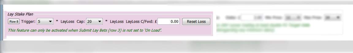 Set the LayLoss Cap. This figure is the maximum multiple of your LAY Stake (row 7) you are now prepared to stake on a Lay. The actual figure will be dependent on the odds /liability of the first lay available after the Trigger has been reached, but will be 'capped' at this multiple. So if your stake is 10, trigger is 5 and your cap is 20, the Lay Stake Plan will kick in and submit the next lay/s. The last of which will be a maximum 200. Should this final Lay bet in the sequence not go your way, the next Lay stake will revert to the original value of 10. Note your other lay settings will also be respected.