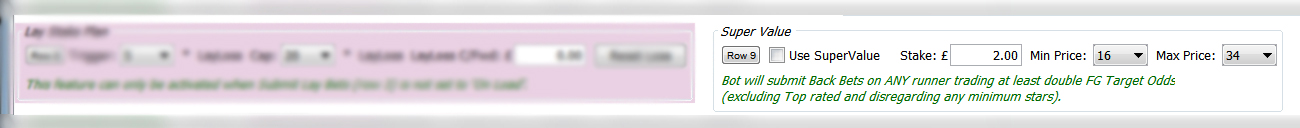 Note: If you are using this feature as well as submitting regular Backs then it is important to realise that the success ratio of these types of bets dictates that it is most efficient where the Use SuperValue is =< 20 percent of your Back Stake (row 5). For example, using the min Betfair stake of £2.00 would mean your Back Stake (row 5) should be at least £10.
