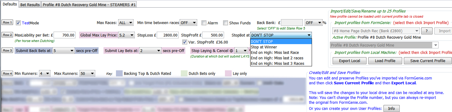 1. The Variable Stop Profit can only be invoked when using a Dutch Recovery profile and assumes that all Race Codes and Race Types are selected (row 11) AND the bot is started before racing starts. This VSP value will not be correct if starting the bot midway through racing.