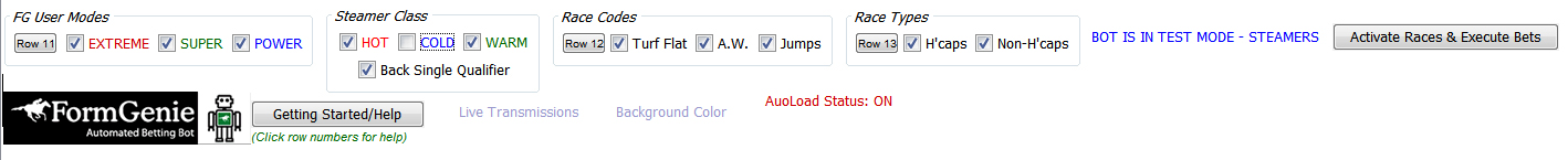 When TestMode is checked FormGenie-Bot will operate and pretend to submit bets without actually placing bets. This is so you can test your settings and systems without risk. Highly recommended until you are sure of your strategy. Be patient before going live as you have the Bot for at least a year. Note: Betfair may not like prolonged testing without live transactions as they may regard you as data collecting. Simply make sure you place a small bet on the exchange (doesn't have to be via the bot) every few days.