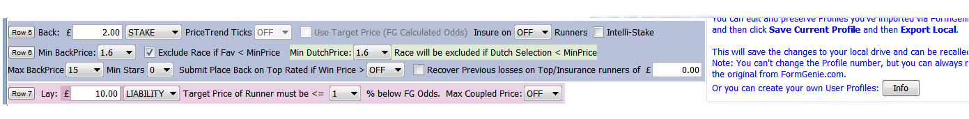 This is a really valuable tool and should not be underestimated. Essentially it's a way of cherry-picking the races where the Dutch Rated (which remember includes the Top Rated) have the best chance of winning according to the market a millisecond before the bot places or excludes our bets. It works by coupling the live odds of the two shortest FormGenie selections, dividing by 2 and deducting 1. The smaller this resulting number the better chance we have of winning according to the extremely significant live market. Remember that the smaller the odds the larger the stakes when in target Recovery Mode.